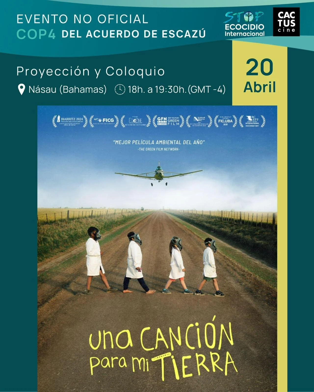 El evento paralelo “Una canción para mi tierra: arte, defensa ambiental y derechos de la niñez frente a los agrotóxicos” es una actividad virtual organizada por Stop Ecocidio Internacional y Cactus Cine en el marco de la COP4 del Acuerdo de Escazú.